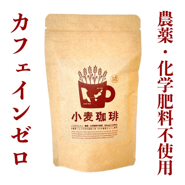 【送料無料/数量限定】 小麦珈琲 100g 「小麦珈琲」は、厳選された小麦を使用して作られたコーヒー豆を使用しない小麦オンリーの穀物コーヒーです。 農薬や化学肥料を使わずに栽培された沖縄県うるま市伊計島産の小麦をじっくりと焙煎して作られています。スッキリとした苦味と香ばしい香りが特徴です。 この「小麦珈琲」コーヒー豆を使ってません。 カフェインを摂りたくない方や、就寝前でも安心して飲むことができます。 ▶︎飲み方:基本的にドリップコーヒーと同じように紙フィルターなどを使用してドリップしてお飲み頂けます。袋の裏面においしい淹れ方も記載してますのでご安心ください。 ▼沖縄タイムス「ヒットのたまご」にご紹介いただきました▼ https://www.okinawatimes.co.jp/articles/amp/1236041 ▼2023年週刊レキオ様にご紹介いただきました▼ http://www.lequio.co.jp/pc/show2.php?c1=03shi&c2=2023&vol=1991 〈商品について〉 ■コーヒー豆は不使用です。 ■穀物コーヒーというジャンルです。 ■商品の発送は入金確認後、4営業日程度で発送致します。 ■原材料は小麦です。小麦アレルギーにはお気をつけ下さい。(沖縄県うるま市伊計島産) ■品名:小麦焙煎茶(中細挽き) ■内容量:100g ■賞味期限:製造から約1年半(約540日) ※商品裏面の一括表示欄に記載 ■製造者:宿&喫茶アガリメージョー